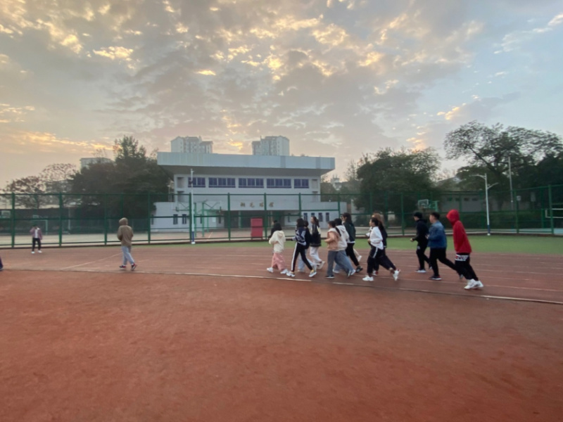 清晨,山间雾气未散,微光穿透云层洒向四运的操场。虽然已是深秋,但清晨的凉意丝毫未能阻挡同学们晨起锻炼的热情。七点整,西塔学子在助理教官的带领下,整装待发。晨跑不仅有助于提高身体素质,坚持运动也有助于培养同学们的纪律意识。听!脚步踏在操场上的声音,铿锵有力,整齐划一,同学们“一、二、一”的口号声响彻云霄,在充满朝气的律动中迎接校园的第一抹朝阳,四运的清晨尽展西塔人的蓬勃气息。