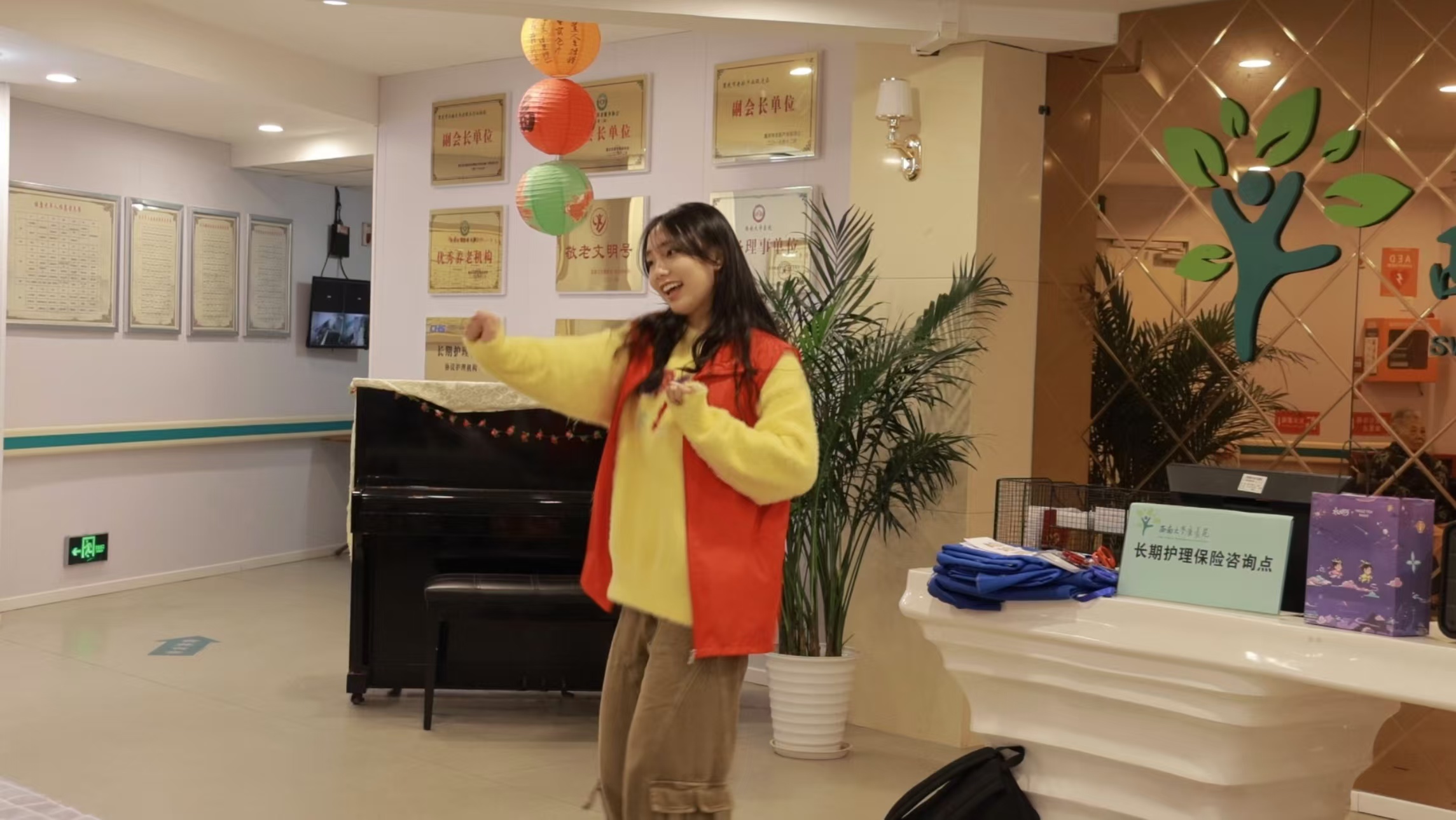 随着主持人刘子权简介的开场致辞,文艺汇演正式拉开帷幕。杨雅雲同学以一首活力四射的《perfect night》舞蹈点燃了现场气氛。她的舞姿轻盈优美,青春活力四溢,瞬间吸引了老人们的目光,赢得了阵阵掌声,为整个汇演开了个好头。