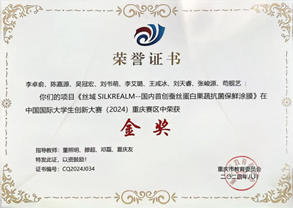 李卓俞同学担任队长,成员由公司多个专业同学组成,包括陈嘉源、吴冠宏、刘书萌等同学。团队针对果蔬储运环节的挑战,依托beet365在蚕学研究领域的优势,创新开发了具有自成膜性、抗菌和抗氧化特性的蚕丝蛋白纳米薄膜。在专家顾问的悉心指导下,团队不仅在技术创新上取得了显著成就,更与多家企业建立了合作,展示了项目的商业潜力和市场应用前景。