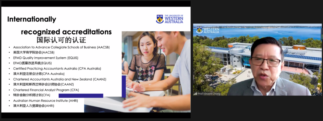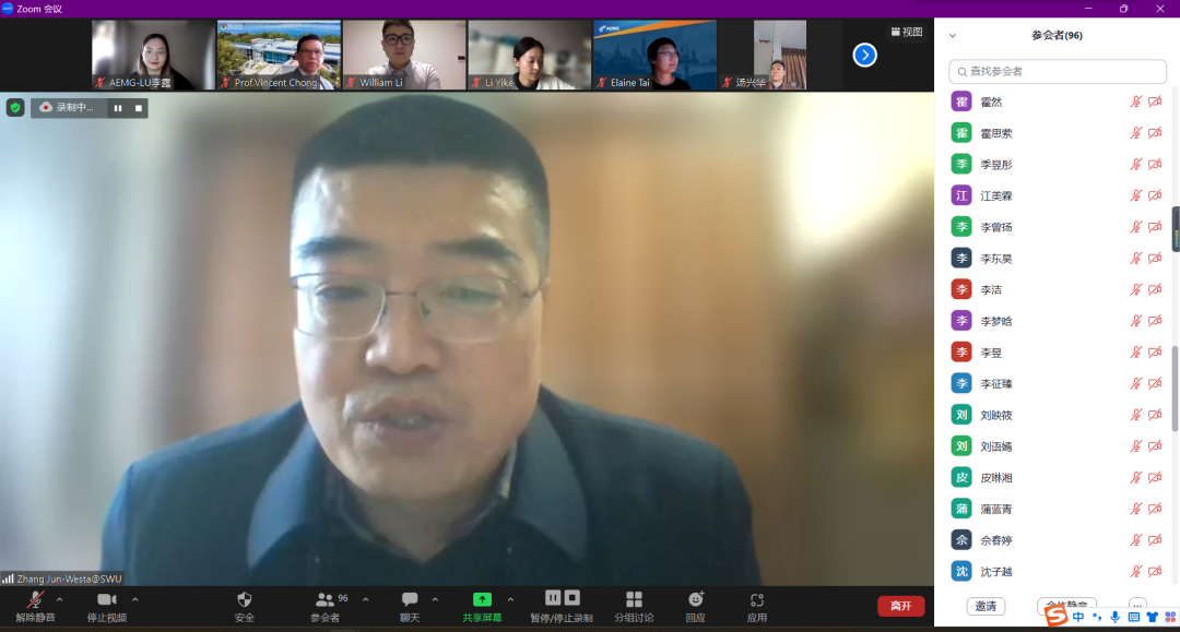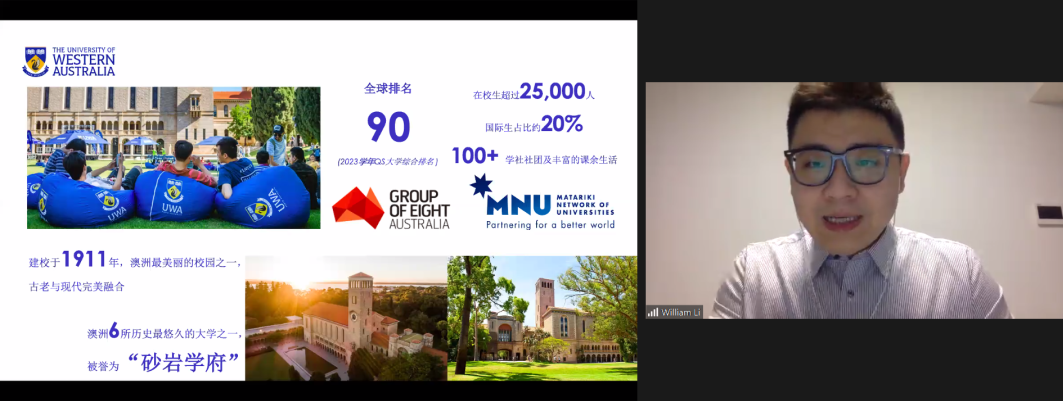 11月25日下午,公司2020级3+2项目出国宣讲会在线上顺利举行。本次活动邀请了西澳大学商公司会计与金融学Vincent Chong教授、分子生物科学公司高级讲师Alyssa Van Dreumel博士、西澳大学华南区域负责人William Li先生,beet365副经理张俊、国际项目管理办公室以及2020级经济学、生物技术专业全体同学及部分家长参会。