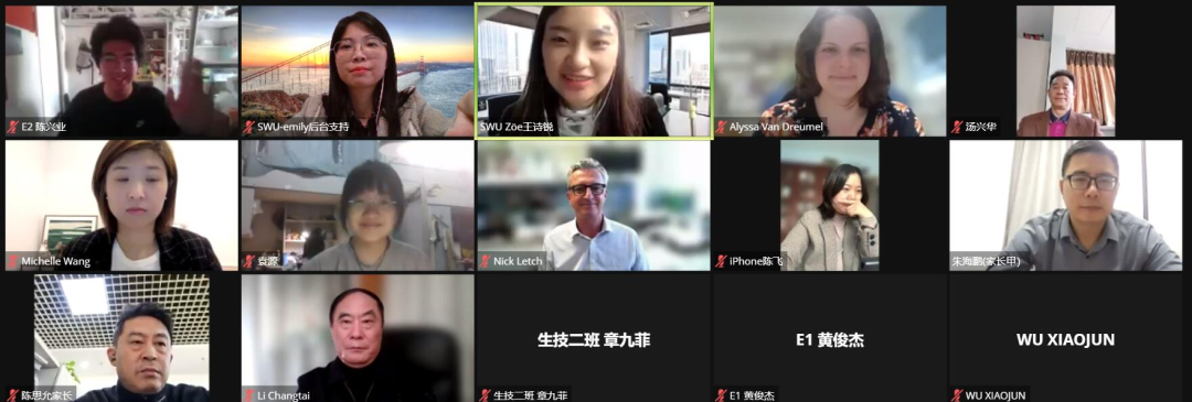 交流环节,2021级四个专业学子们踊跃提问,就赴西澳大学学习的要求、专业课程体系、实习机会、就业前景、员工服务以及专业具体问题与老师积极交流。公司已赴澳的海外员工,用视频的方式与学弟学妹们分享他们在澳大利亚丰富多彩的学习生活,鼓励同学们选择适合自己的学习方式。