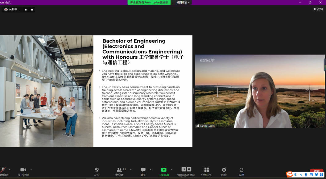 塔斯马尼亚大学工程公司经理Tim Finnigan教授致欢迎辞。Alistair Gracie教授和Sarah Lynden博士分别向同学们介绍了食品质量与安全专业、电子信息工程专业2+2培养模式,同时,他们就专业现状、课程设置、团队力量、教学实践、住宿条件、奖学金政策、就业前景、海外健康与安全等多方面进行综合解读,并鼓励同学们主动和澳方老师沟通交流。