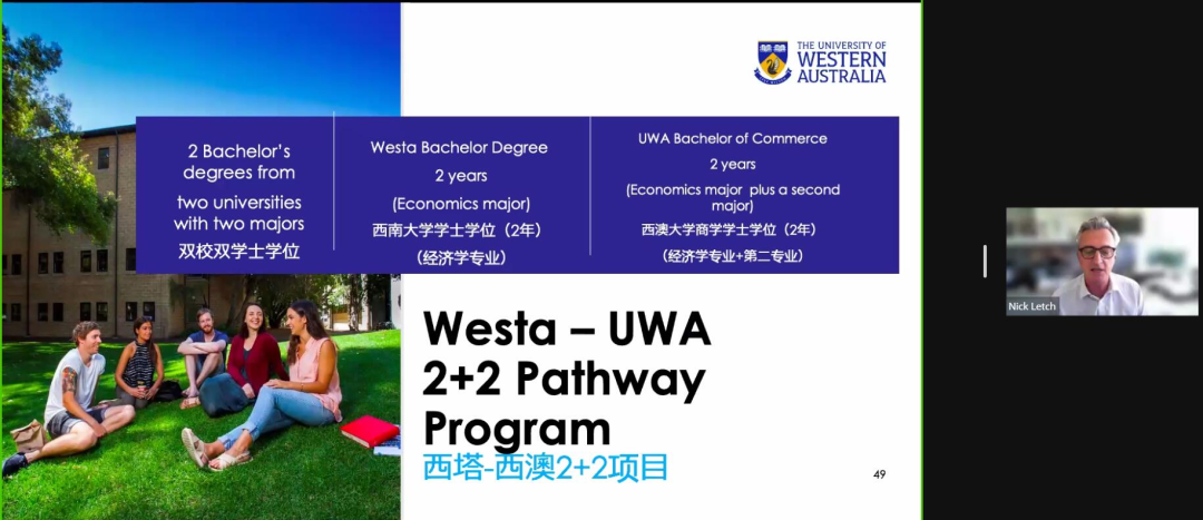 西澳大学Nick Letch副教授和Alyssa Van Dreumel博士分别解读了经济学、生物技术专业2+2培养模式。他们介绍了珀斯城市环境、公司国际声誉、全球合作、培养模式、授课方式、员工活动等内容,并谈到西澳大学拥有灵活的选课机制,同时西澳大学与当地政府、企业间的密切合作,能够为西澳学子提供丰富实践机会的优势。