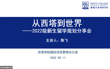 公司国际项目管理办公室主任陈飞以“从西塔到世界”为题,就新生留学规划作专题指导。她分析了当前留学形势,鼓励大家不断开拓视野,积极在全球范围内寻找自己的梦想高校深造,成为国际型复合人才。随后,AEMG代表陈思迅老师分享了公司在国际课程、双语教学、升学就业等方面的优势,并详细介绍了西澳大学与塔斯马尼亚大学的教学科研情况、全球排名等。