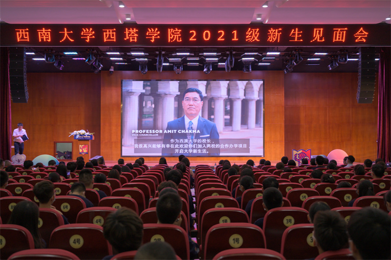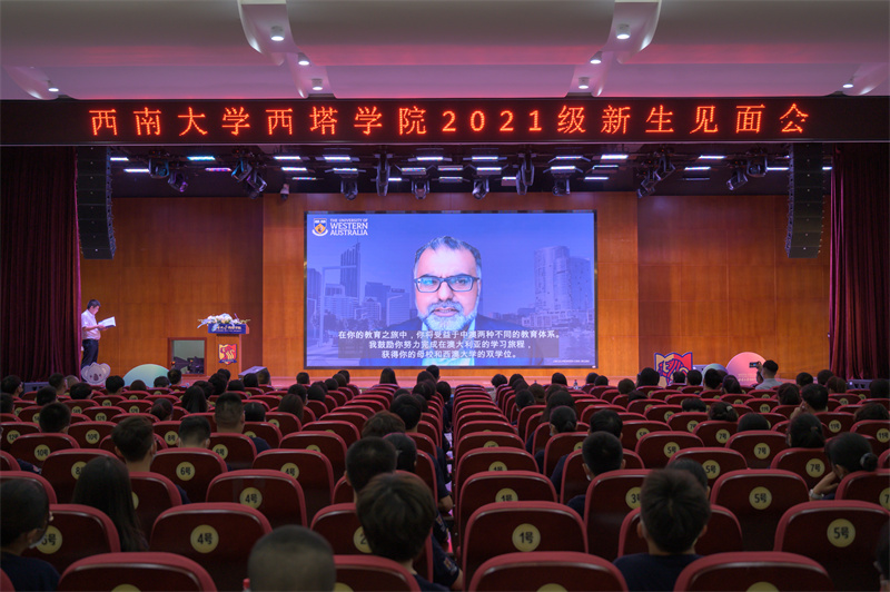 受疫情影响,合作高校领导未能亲临现场。西澳大学董事长Amit Chakma教授发来视频致辞,向2021级西塔新生表示热烈欢迎,强调参与大学丰富活动的重要性,并向新生们介绍了排名世界百强的西澳大学在学术研究、创新创业以及校园环境上的卓越平台。西澳大学常务副董事长Tayyeb shah教授在视频中表示参与两校的教育之旅将受益于两种不同的教育体系,获得高质量的教育和国际体验。
