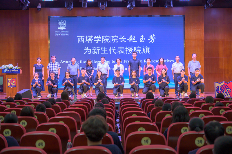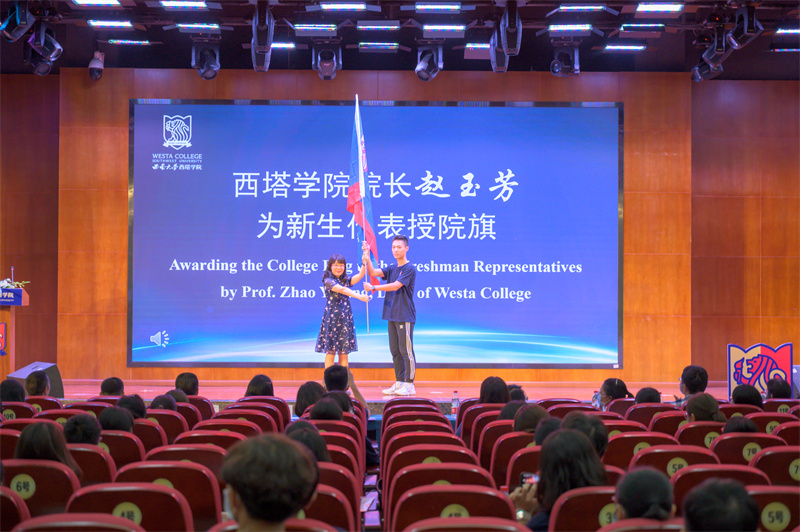 beet365经理赵玉芳为新生代表授院旗,标志西塔蓝的院旗在空中高高飘扬,彰显着新的力量与气象。随后,与会领导为新生授予院徽。