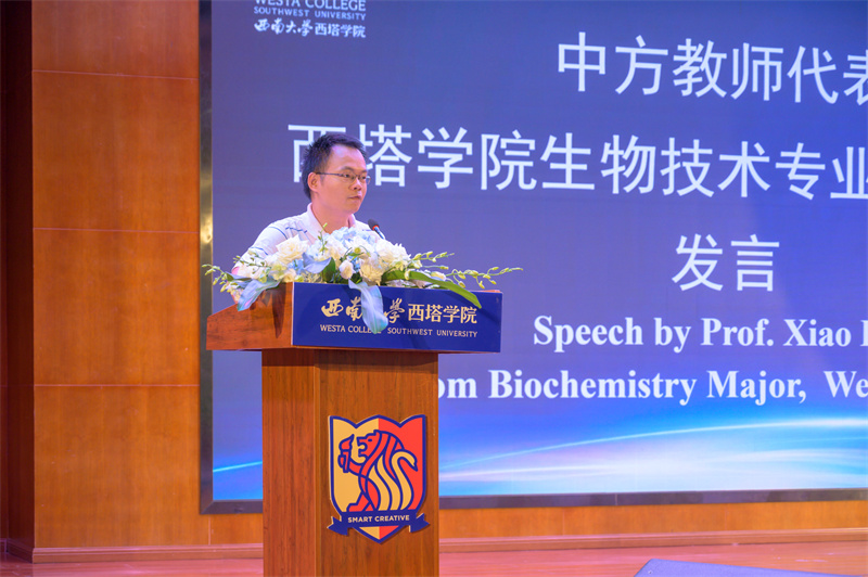 生物技术专业肖波教授作为中方教师代表发言,对新生提出几点建议,希望大家学以明志,明确方向;坚守诚信,心怀感恩;勇于尝试,敢于突破;享受大学,拓宽格局。在思考这一维度不断试错,不断经历,为创造更多“从0到1”的突破打好根基。