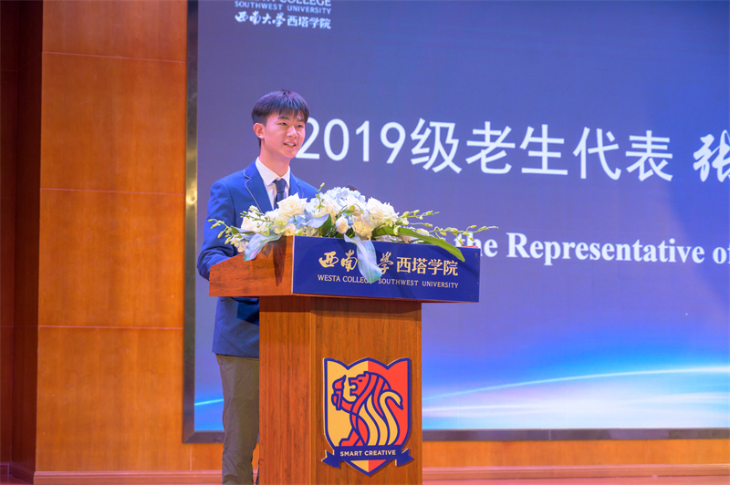 2021级生物技术专业的黄驰程同学作为新生代表发言,向现场领导与老师表达衷心感谢。他表示,作为西塔学子,应具有国际化视野,明辨是非的能力,有大的格局和大的胸怀,坚定理想信念,弘扬社会主义核心价值观,争做一名又红又专的时代新人。