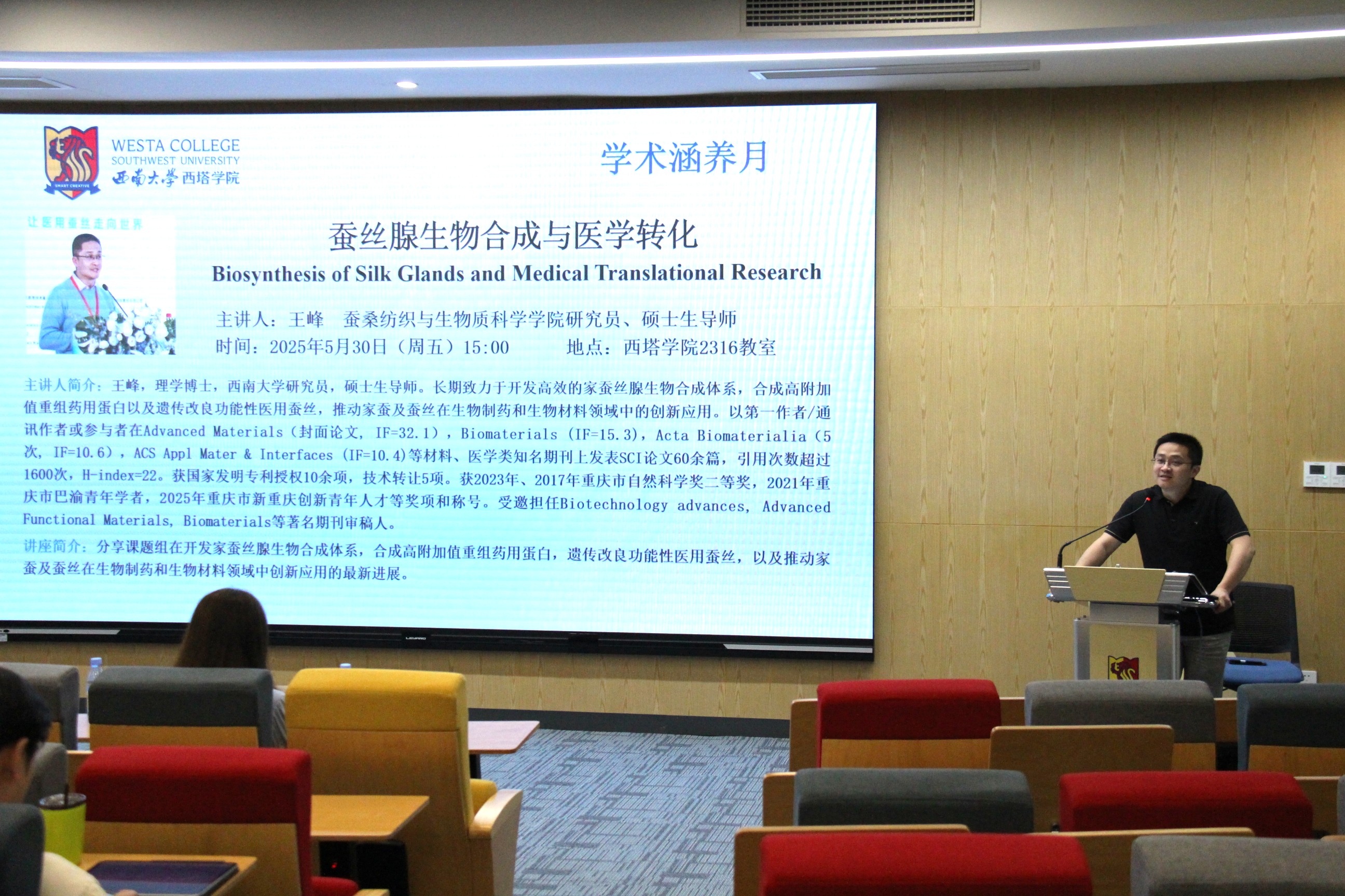 在生物技术专业专场讲座上,王峰研究员围绕“家蚕丝腺生物合成与医学转化”这一主题,分享了其课题组在开发家蚕丝腺生物合成体系、合成高附加值重组药用蛋白、遗传改良功能性医用蚕丝,以及推动家蚕及蚕丝在生物制药和生物材料领域中创新应用的最新进展。其课题组在家蚕丝腺生物反应器研究中取得重要突破:成功建立高效合成系统,培育出50余个新型家蚕品系,能高效表达人血清白蛋白、人乳铁蛋白、人胰岛素等高附加值药用蛋白。同时,建立了规模化蚕丝外源蛋白分离纯化技术体系,获得了多个毫克级高纯度、具生物活性的重组蛋白,证实家蚕丝腺可生产功能性外源蛋白。此外,其研究团队建立了蚕丝遗传改良关键技术体系,利用家蚕丝腺规模化生物合成功能性蚕丝原料。通过导入20余种人源生长因子及10余种具抗肿瘤、抗氧化等功能的治疗性重组蛋白,对蚕丝进行遗传改良,构建了可稳定遗传的新型家蚕品系库。