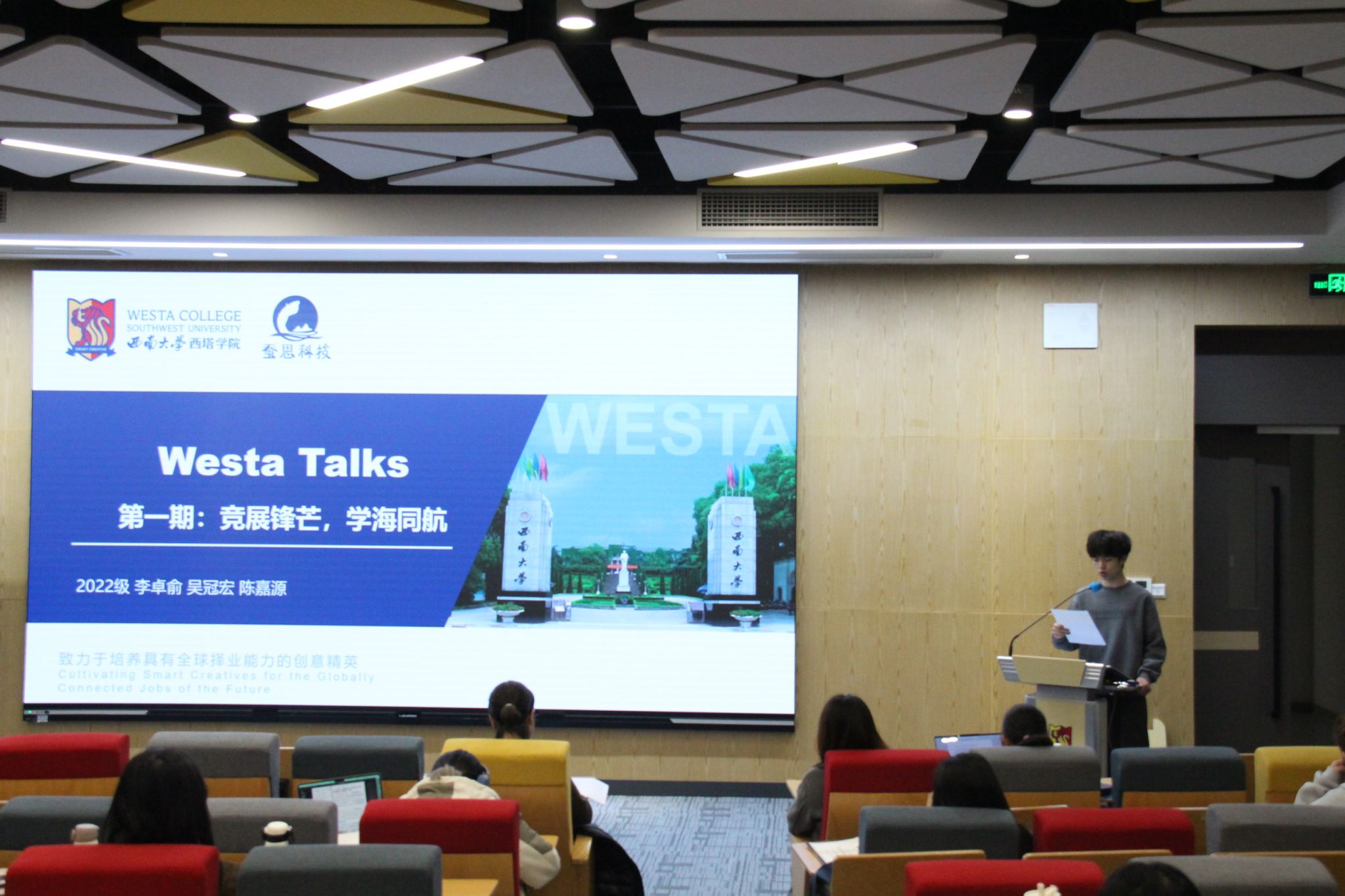 为了更好地激发西塔学子的科研热情,提升创新实践能力,公司于11月23日晚举办了第一期“Westa Talks”学术交流活动。本期活动以“竞展锋芒,学海同航”为主题,特别邀请了2024年中国国际老员工创新创业大赛重庆赛区金奖团队为大家分享科创竞赛和项目申报方面的经验。公司团委书记、员工工作办公室主任(兼)陈飞老师,2022级生物技术专业的李卓俞同学、吴冠宏同学,2022级食品质量与安全专业陈嘉源同学们以及40余名员工出席本场交流会。