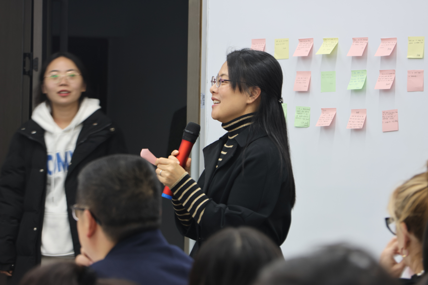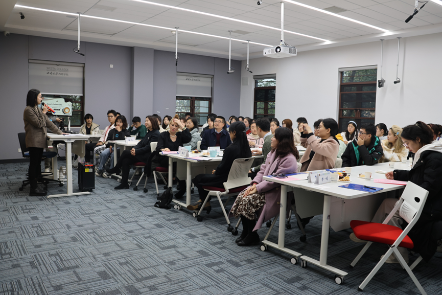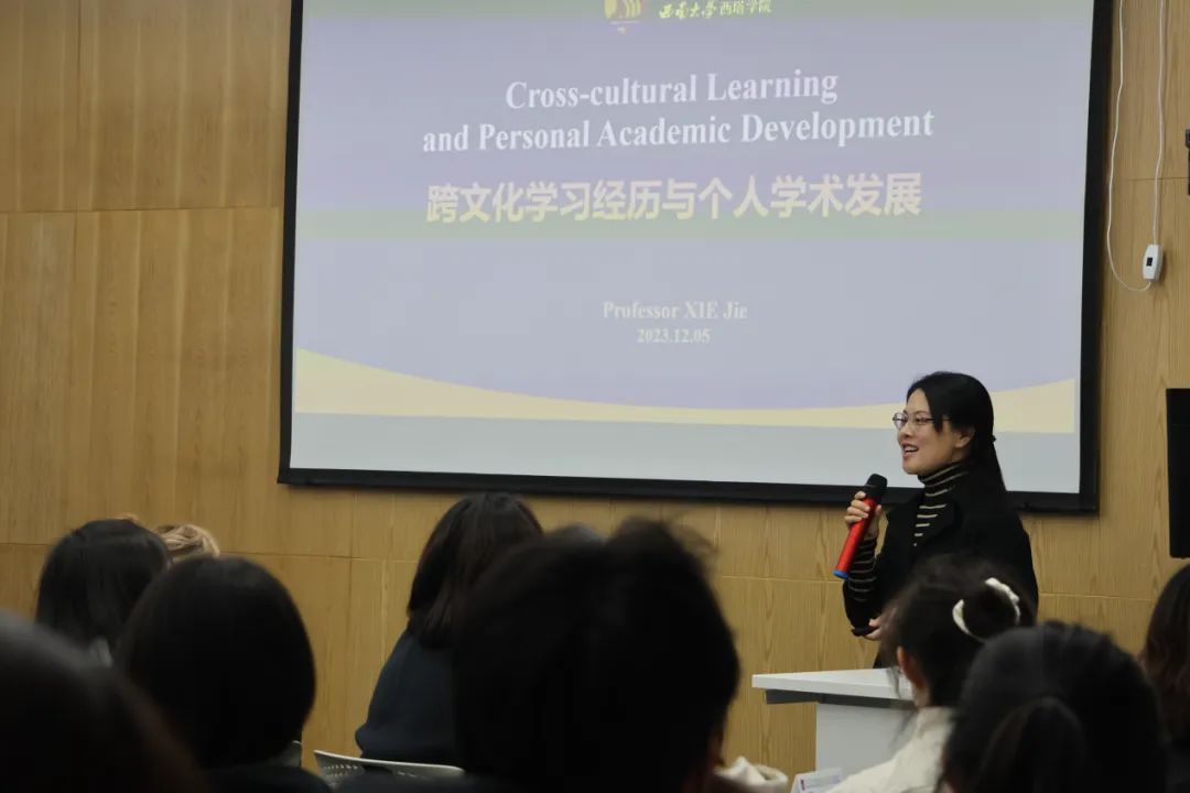 谢洁经理从“Who are we?”提问出发,用生动形象的图片与案例启发同学们对跨文化的思考与理解。她以自己赴美做访问学者期间的经历为例,从个人学术成长、跨文化学习与交流能力、批判创新思维养成等多角度向学子们阐明了开展多元文化交流和学习的重要性。最后,她通过介绍公司为培养具有全球择业能力的创意精英系列举措,鼓励学子们要不断挑战和突破自我,实现从西塔走向世界舞台的飞跃。